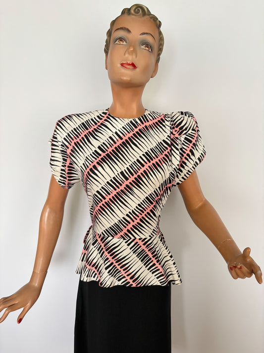 S | 1930s Silk Peplum Blouse with Asian Inspired Medallion Print