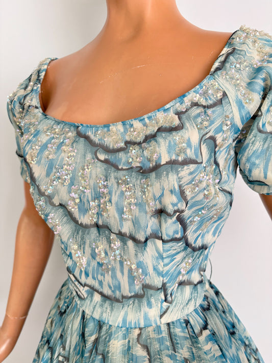 XS | 1950s Blue Chiffon Evening Dress With Sequins