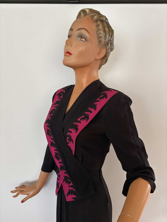 S | 1940s Black Crepe Dress With Deep Pink Cut-Out Appliqué