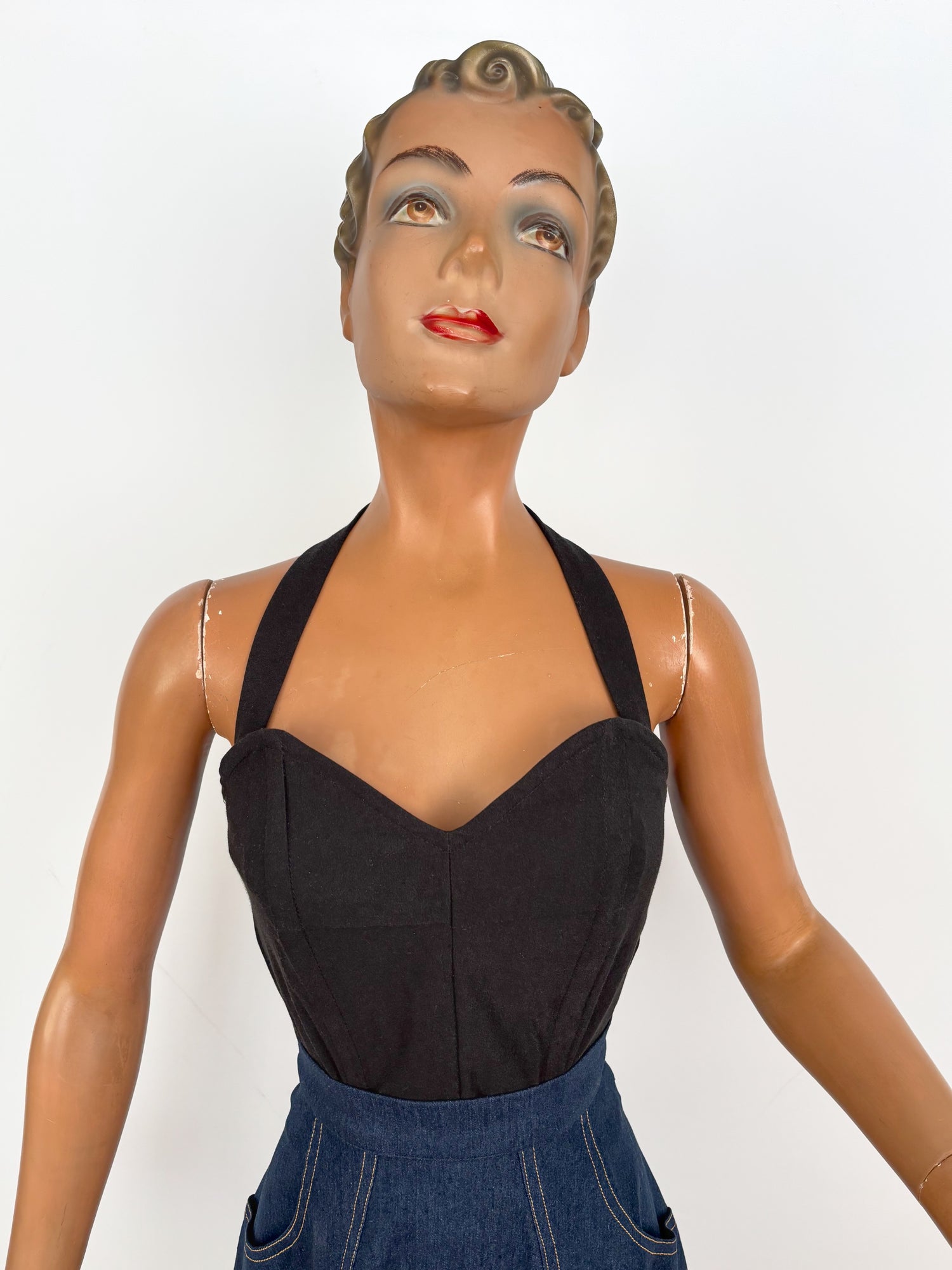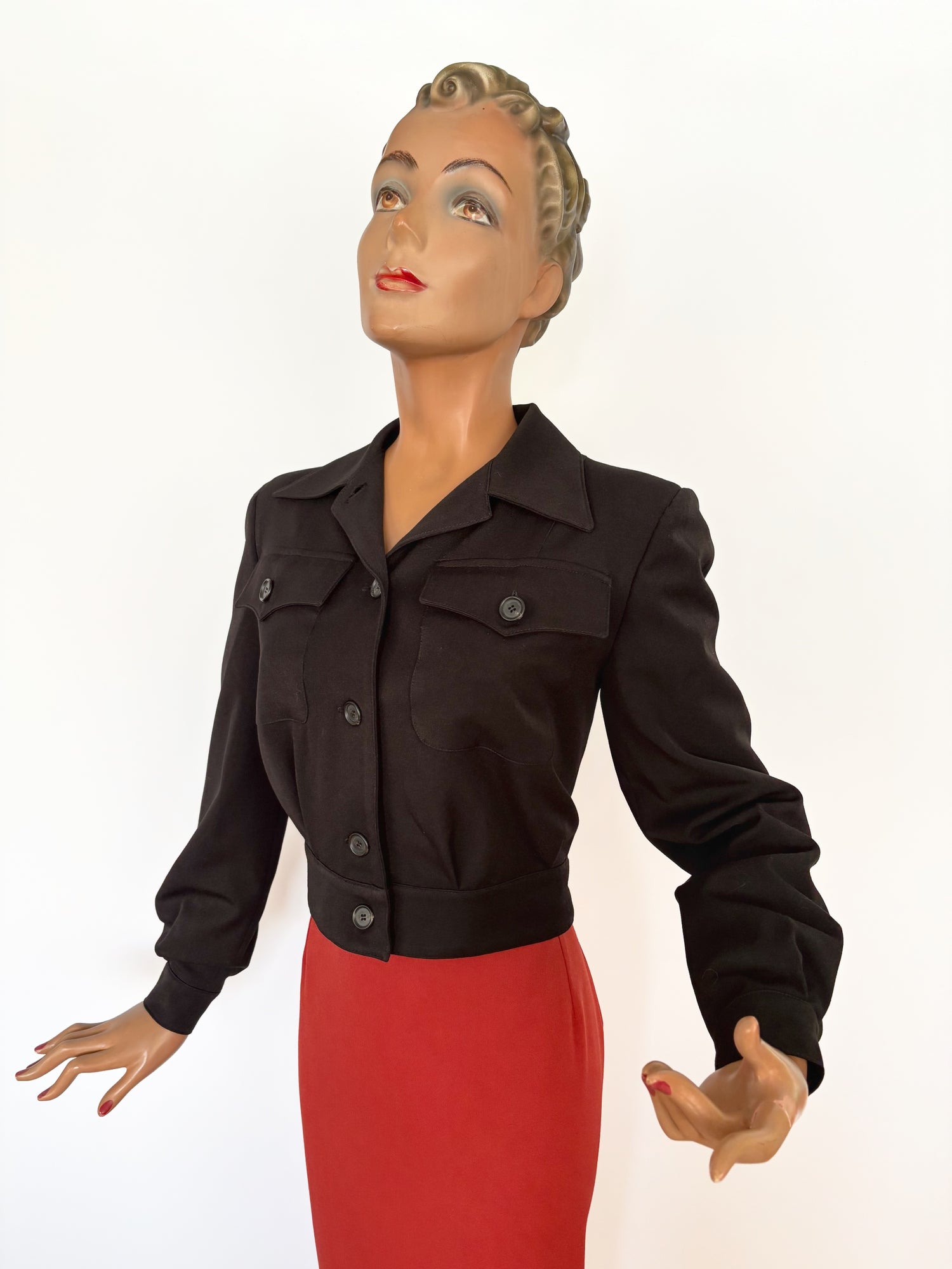 Jacket made using an original 1940s pattern, and that’s something you feel immediately when you put it on. It sits right at the waist, has a compact shape, and keeps a clean, purposeful line. The front pockets button closed, the jacket is fully lined, and there are shoulder pads for that typical 1940s structure without it becoming stiff.