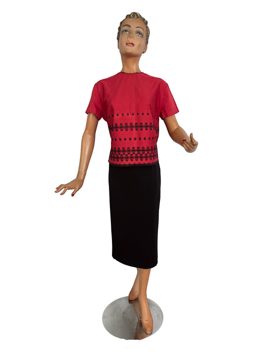 L/XL | 1950s Swiss Embroidered Blouse in Raspberry Red Poplin