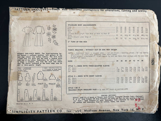 1945 Size 16 Women's One-Piece Dress - Simplicity 1609 Sewing Pattern