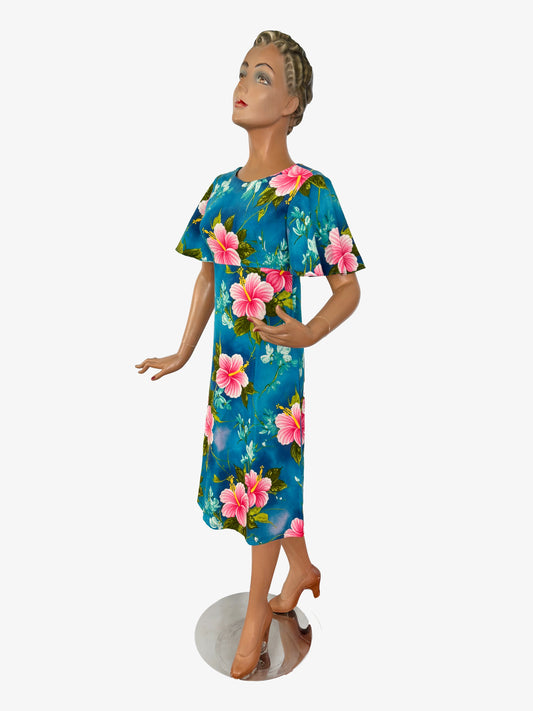 XS/S | 1960s/1970s Blue and Pink Hibiscus Hukilau Fashions Dress
