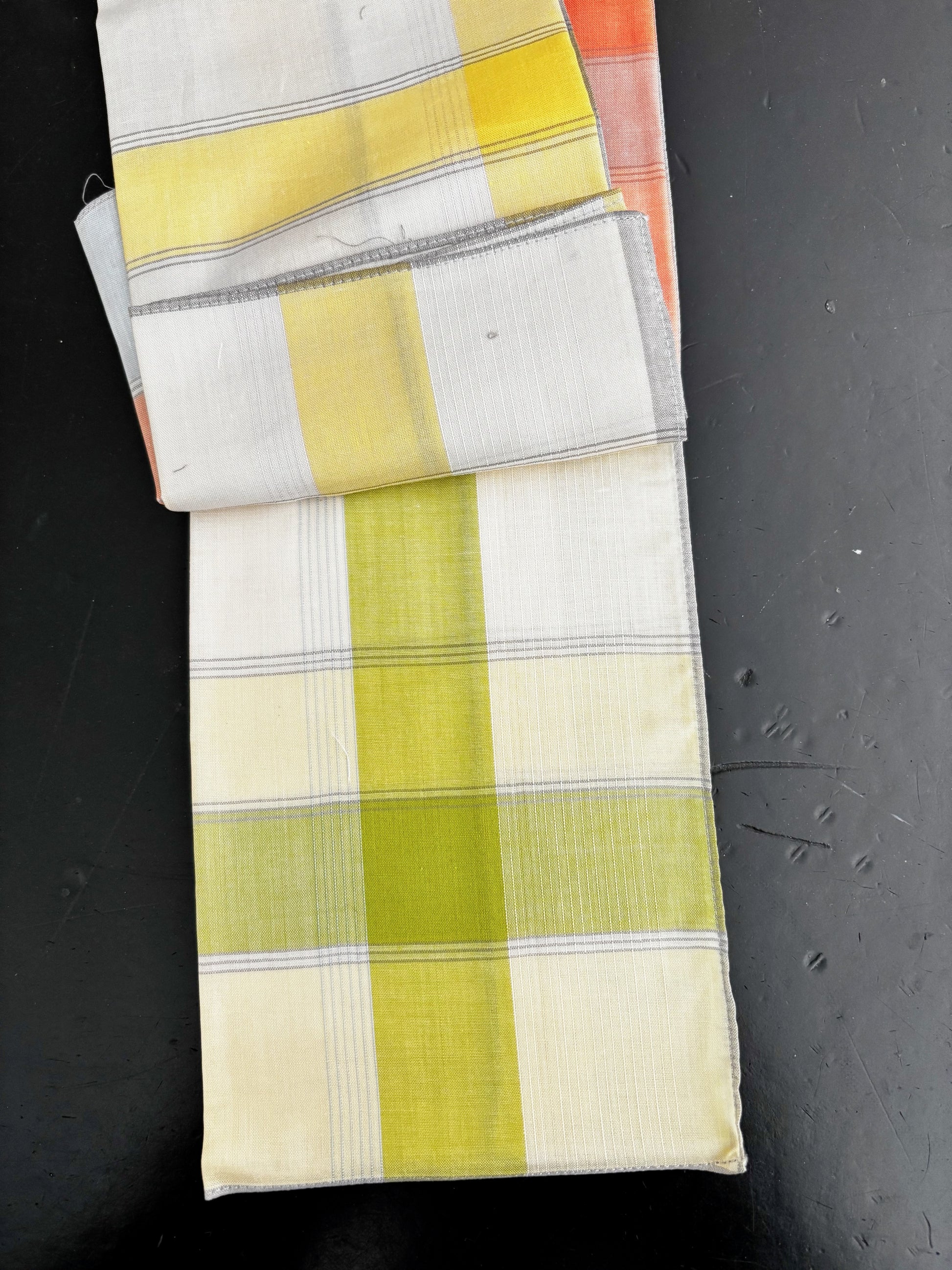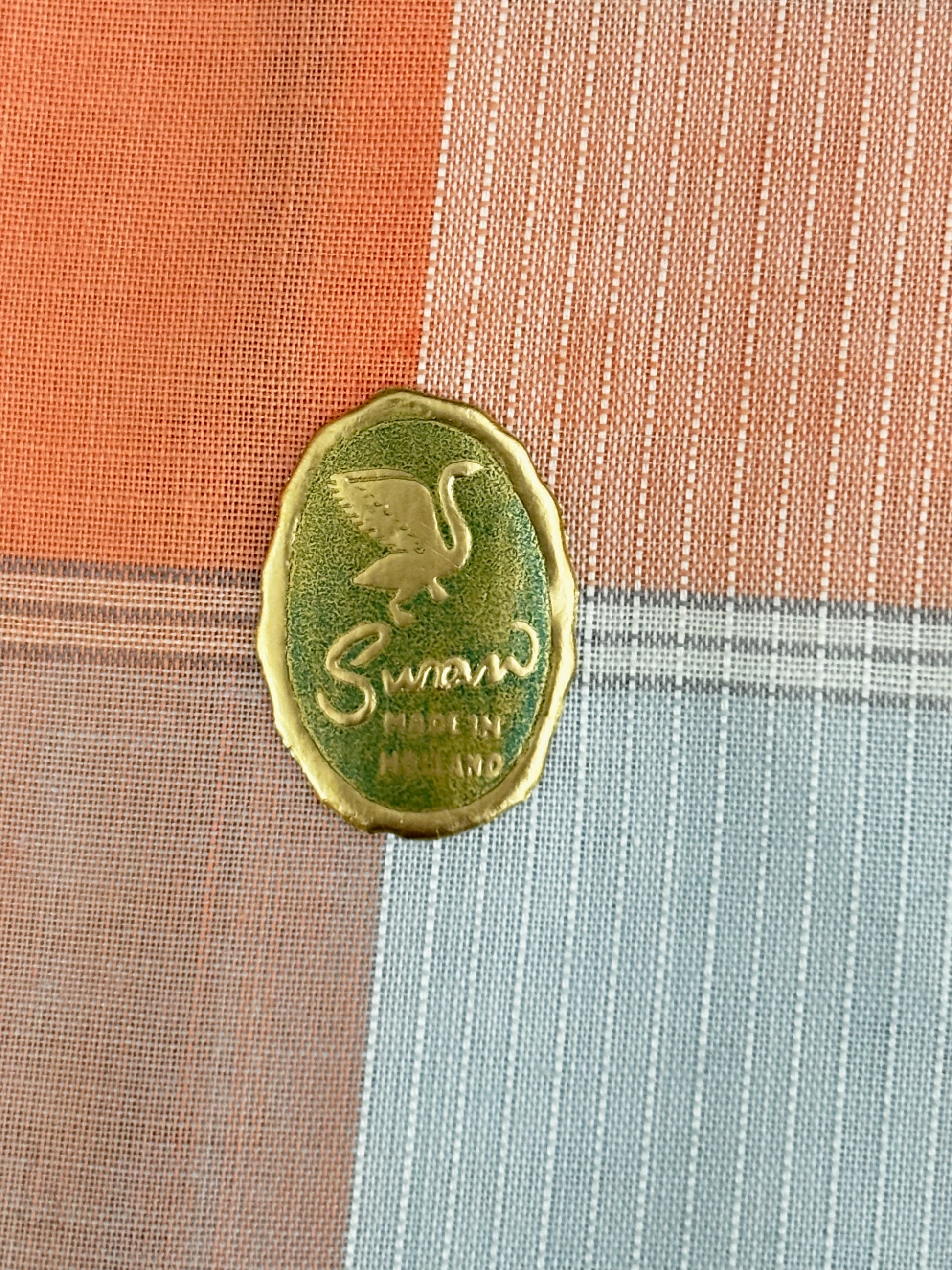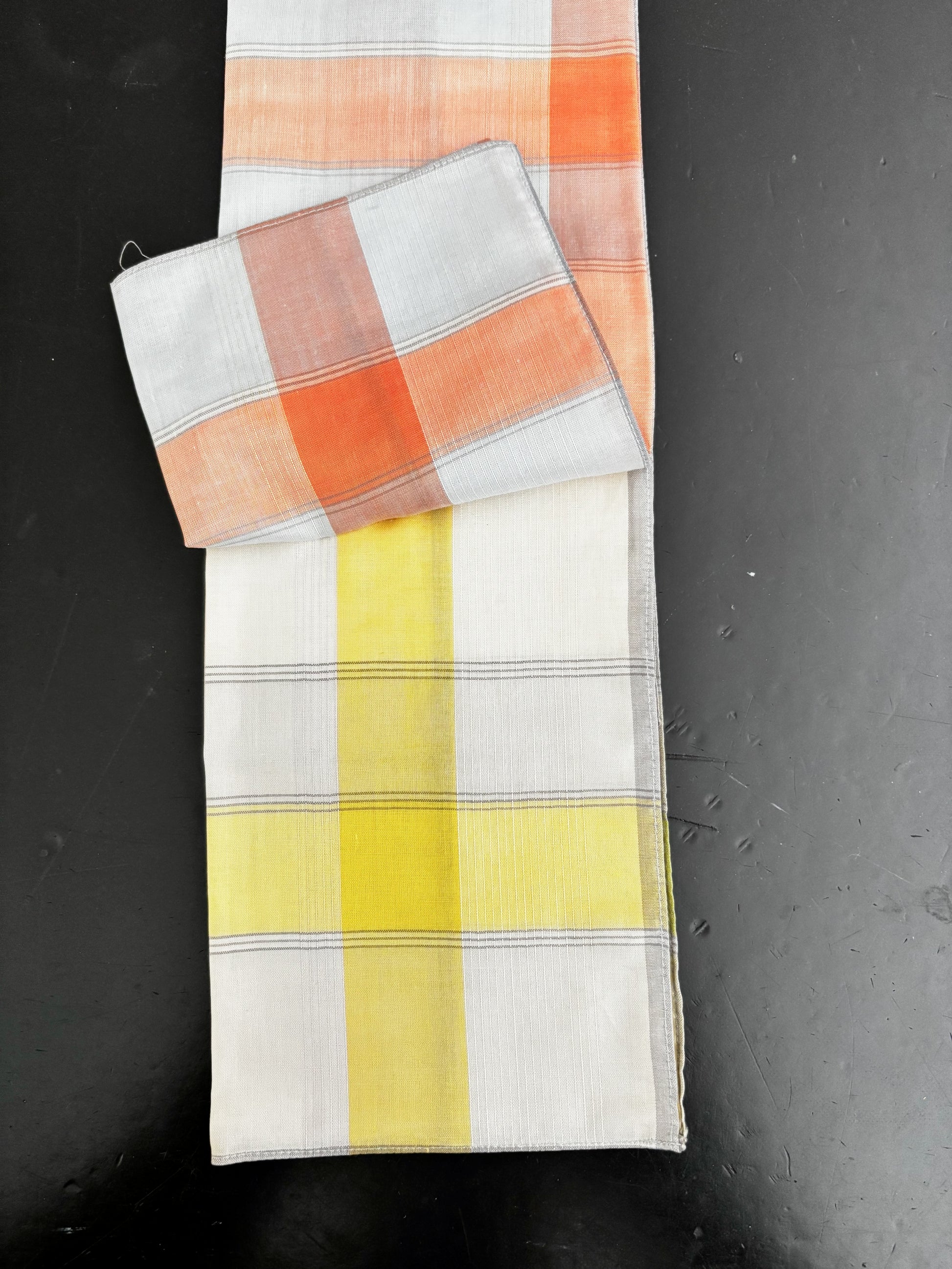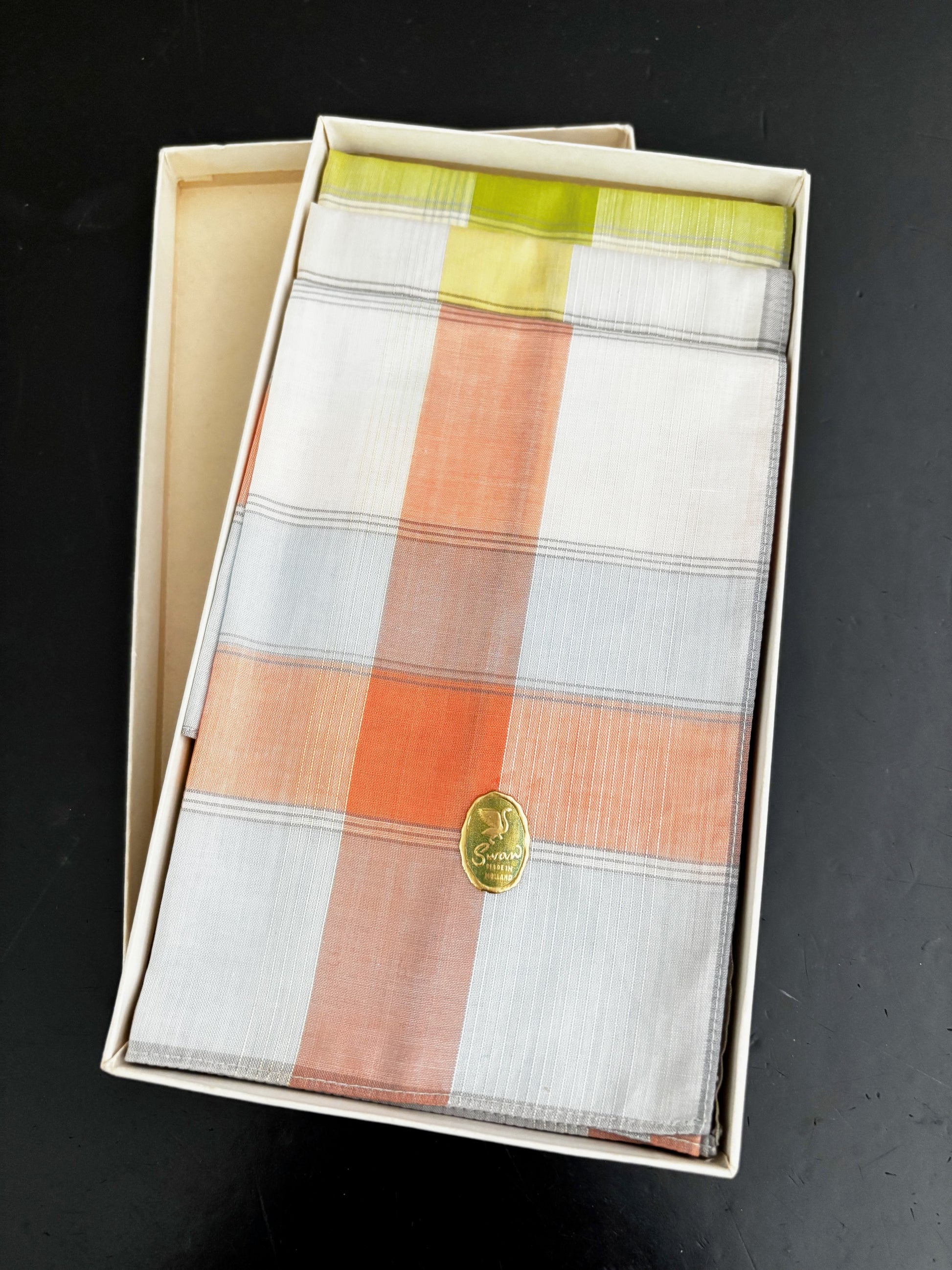 Set of 3 vintage handkerchiefs by Swan, made in Holland. Each handkerchief is cotton with a woven check pattern in bright colours (orange, green, grey tones). They come in the original Swan box with a stylish mid-century illustration on the lid.
