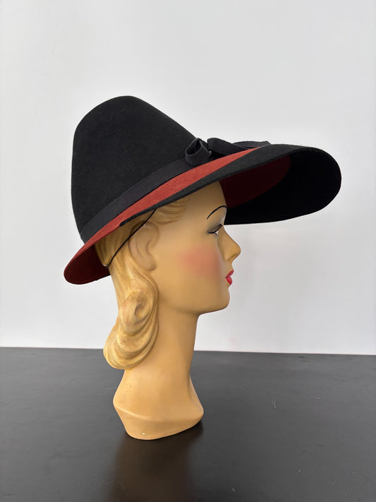 1940s Flamboyant Black Felt Hat with Large Brim and Bow