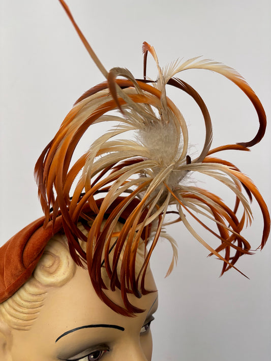 1940s Betmar Rust Velvet Cocktail Hat With Feather Trim