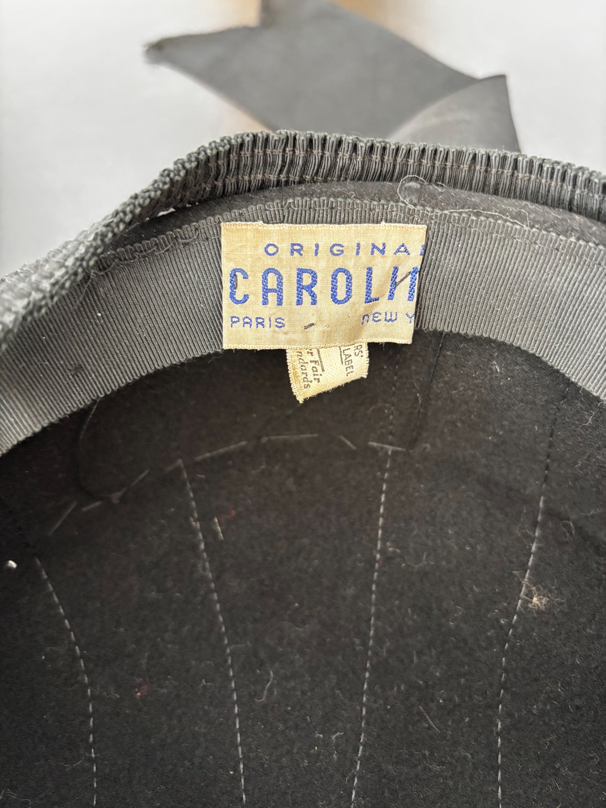 Early 1950s hat by Carolin Original Paris – New York, made of black wool felt with diagonal stitched seams and a long satin bow at the back. The design combines the simplicity of a pillbox with the refined elegance of the New Look era. It has an inner grosgrain band a wide elastic strap to keep the hat securely in place.