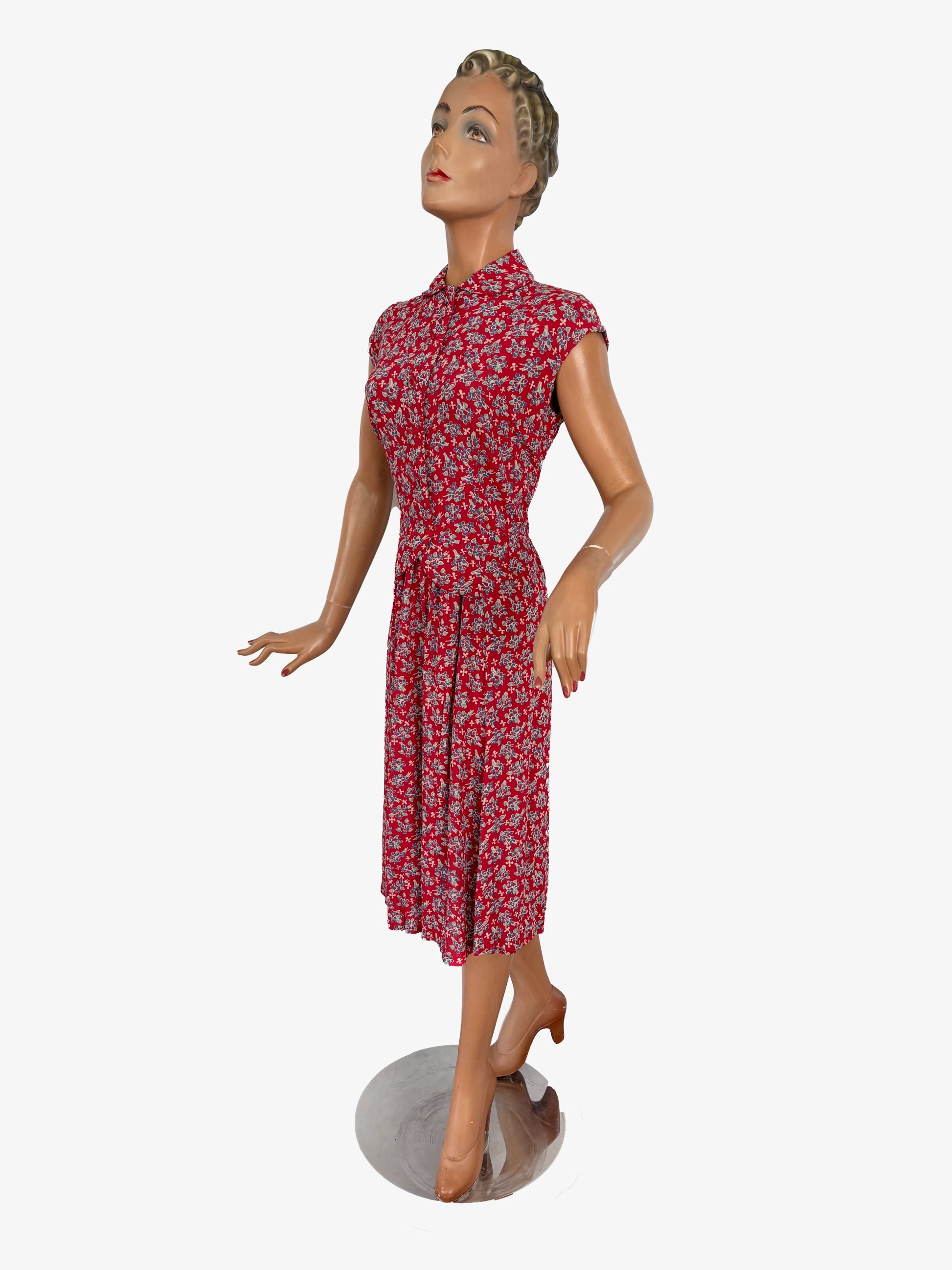 A sleeveless 1940s dress made from red rayon crepe with a floral print in blue and green. The dress has a Peter Pan collar and closes at the front with five fabric-covered buttons. At the left side, it closes with three press studs. The front features a small peplum detail that is secured into the seams.