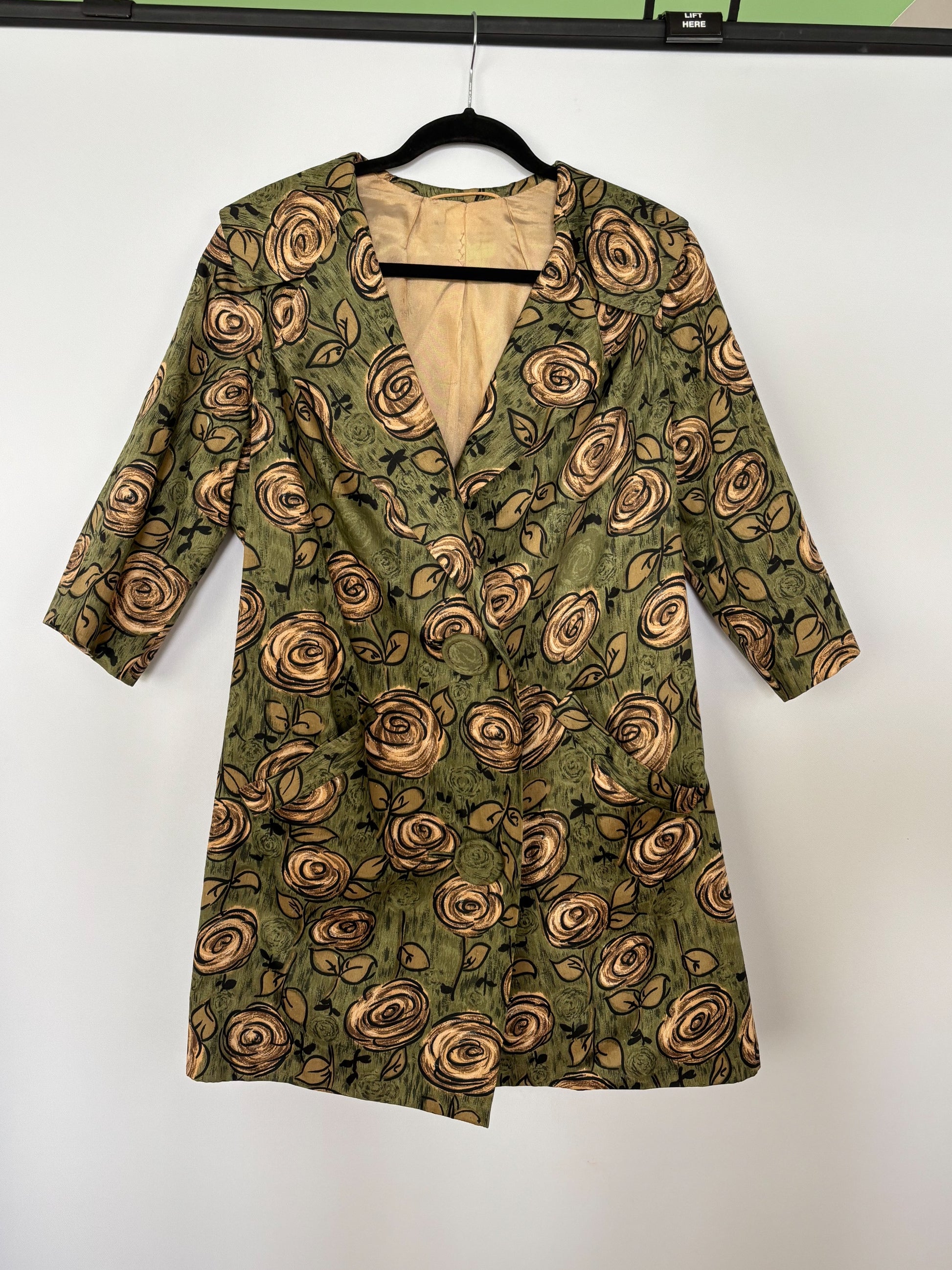 Two-piece late 1950s/early 1960s ensemble consisting of a fitted dress and matching jacket in a textured olive green fabric with an abstract floral print. The dress has cap sleeves, a shaped waist seam, vertical shaping seams from the waist, and a V-back with zipper closure. The skirt is straight cut. The dress is lined at the shoulder area. The jacket has a wide revere collar, 3/4 sleeves, front pockets, and closes with two large fabric-covered buttons. The jacket is fully lined.