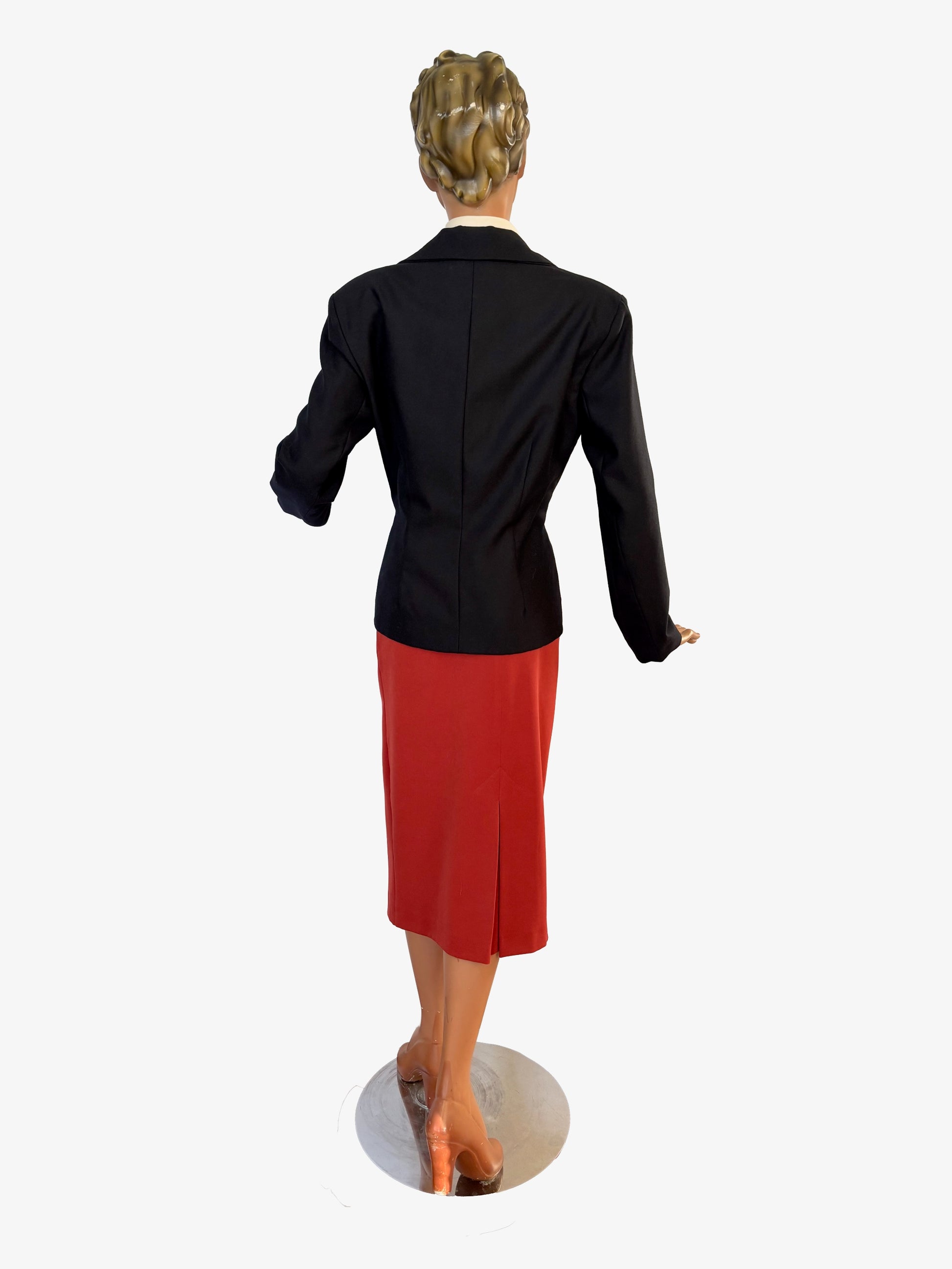 The jacket has a fitted waist, shaped shoulders and closes at the front with three buttons. Additional tailoring seams at the front and back for shaping. The jacket has shoulder pads and is fully lined.