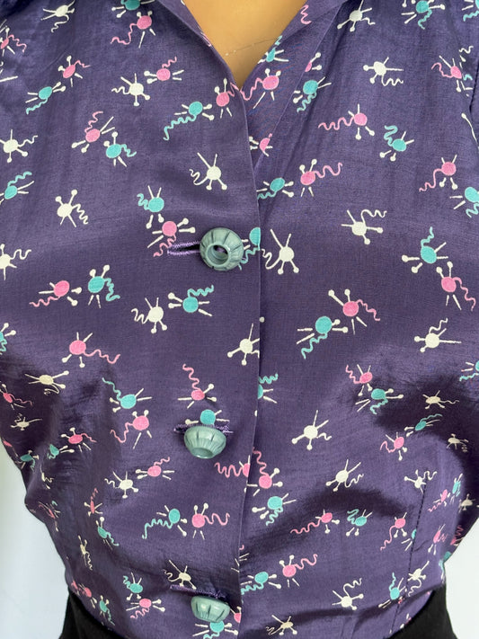 M | Repro Blouse Vintage Yarn & Knitting Needle Print Novelty Silk