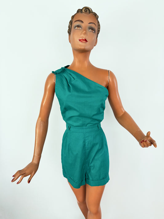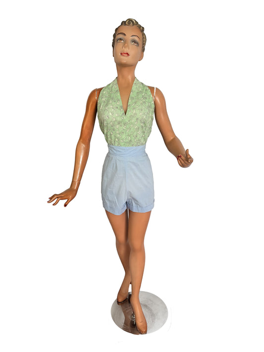 XS | 50s Style Light Green Halter Top with Mandoline Novelty Print