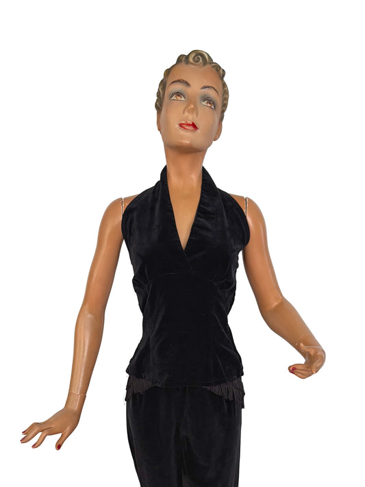 XS/S | 1950s Style Velvet Two-Piece Set with Halter Top and Fringe Capri Pants