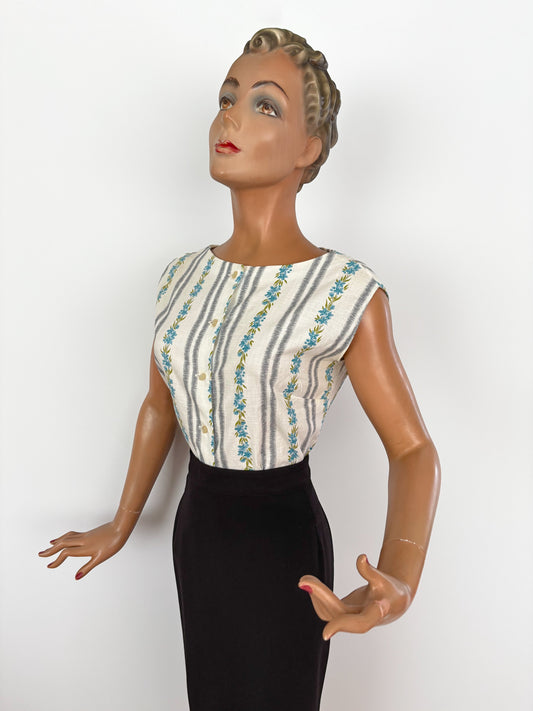 S/M | 1950s Cotton Blouse With Floral and Stripe Print