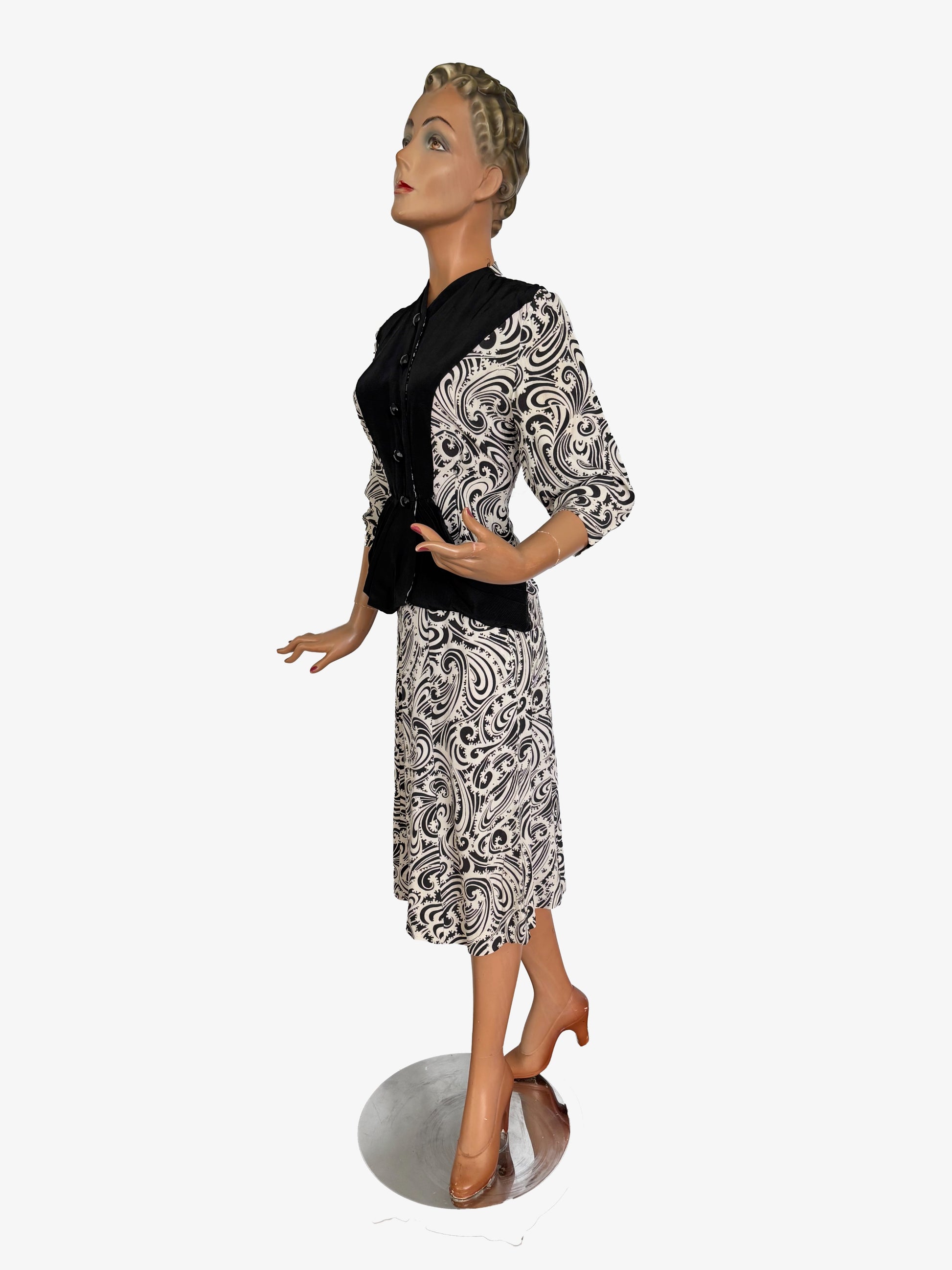 S | 1940s Black and White Paisley Print Two-Piece Suit