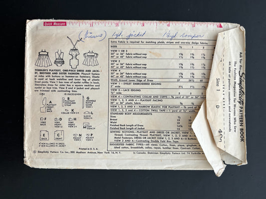 1950s Simplicity 1151 Toddler's Playsuit, One-Piece Dress and Jacket - Size 1