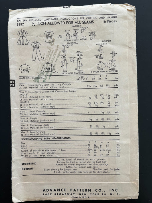 1950s Advance 5382 Sewing Pattern Toddlers Jacket Jumper Overalls - Size 2