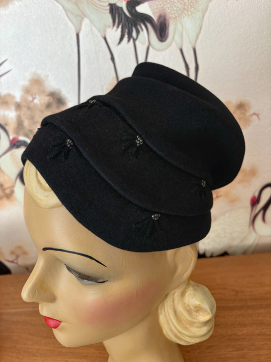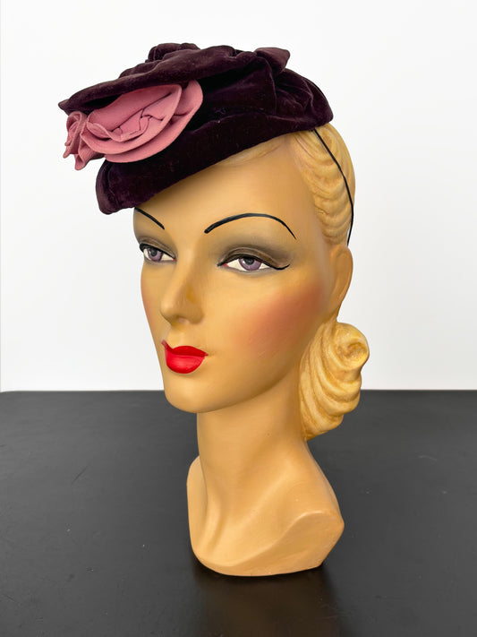 1940s Chocolate Brown Velvet Hat With Pink Roses And Bow