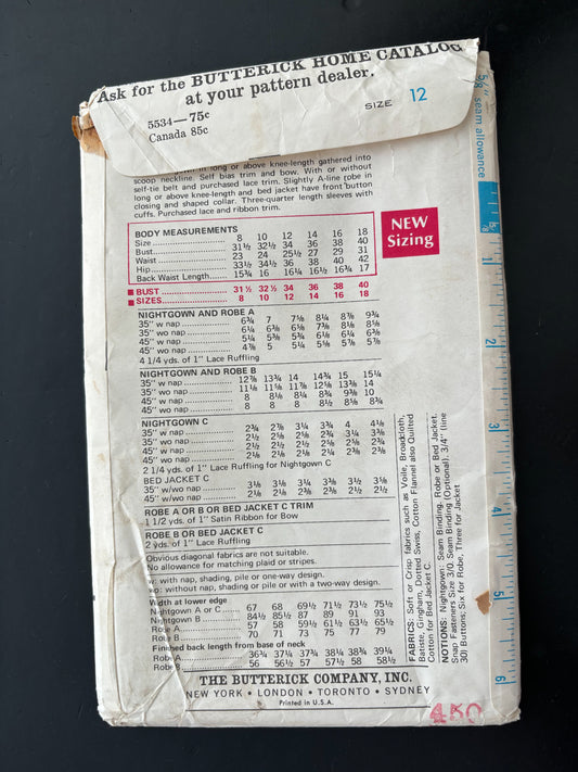 1960s Butterick 5534 Sewing Pattern Misses Nightgown, Robe and Jacket - Size 12