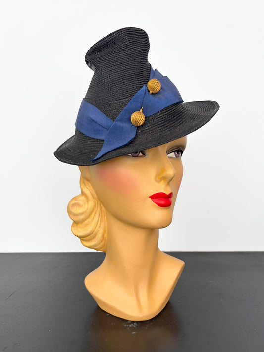 1940s Sisal Chimney Hat with Blue Ribbon and Hat Pin