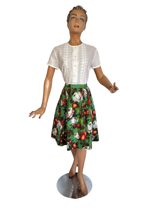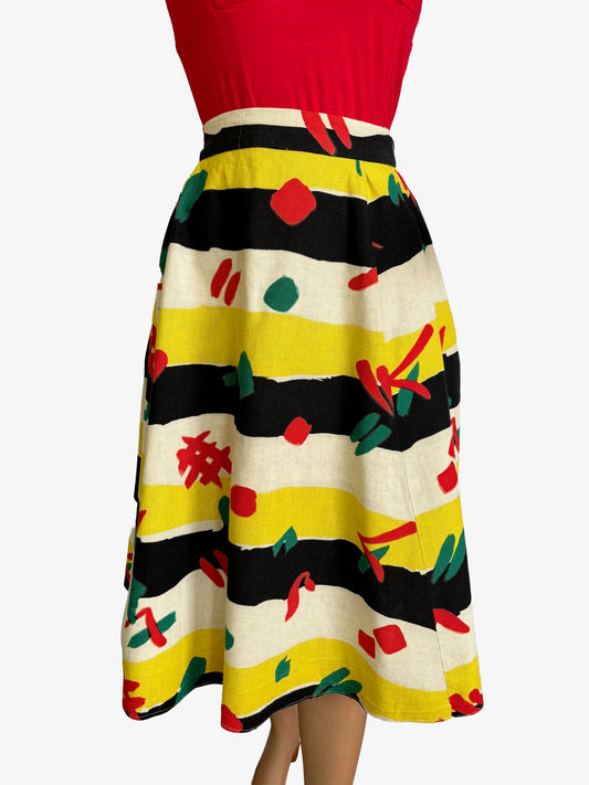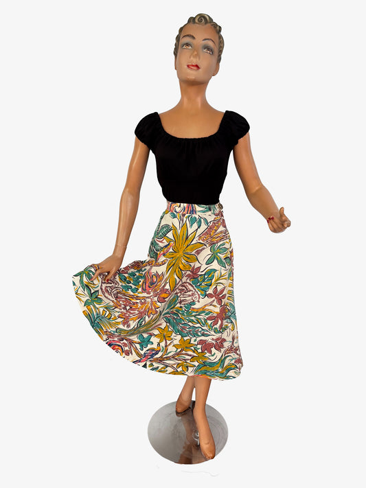 S | 1950s Hand-Painted Mexican Jungle Skirt with Monkeys and Birds