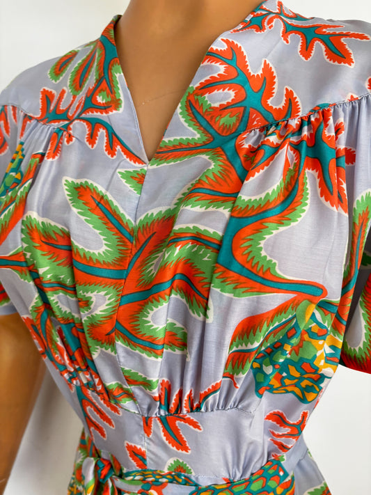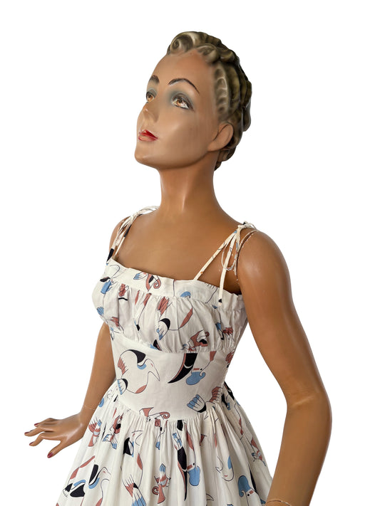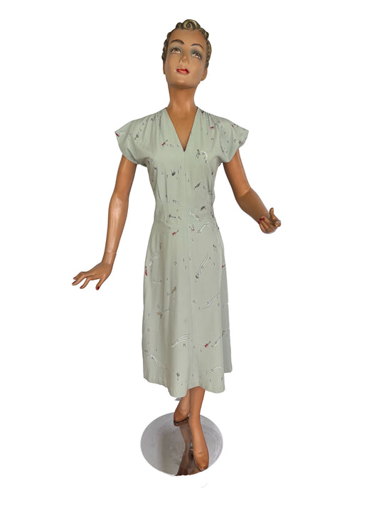 S | 1940s Style Vintage Gabardine Hand Painted Musical Novelty Print Dress