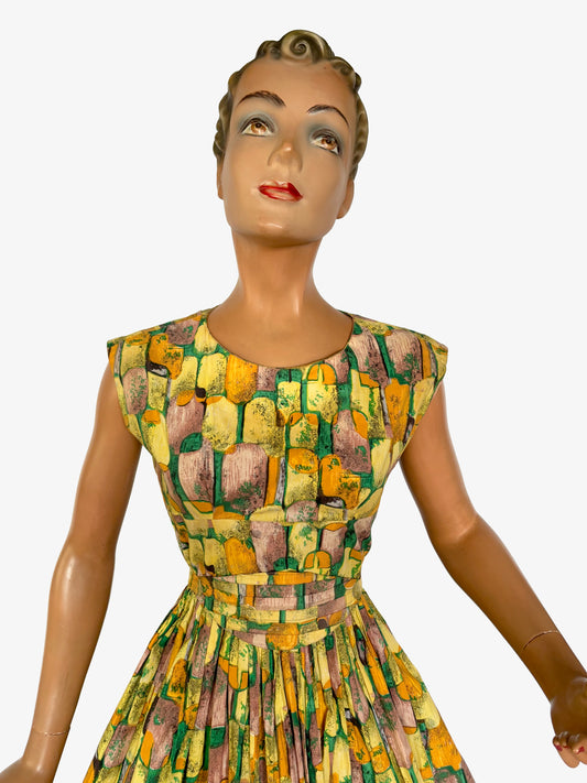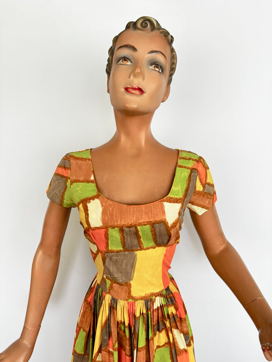 S | 1950s Belted Cotton Dress Anne Bonnet Fabric