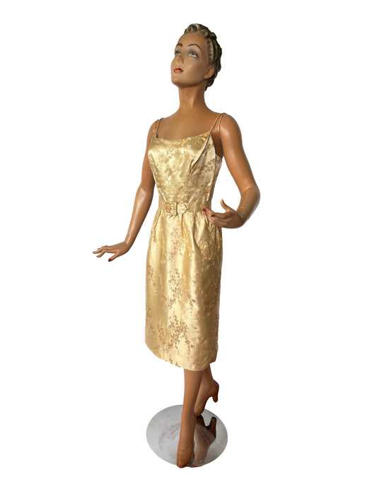 XS | 1950s Alfred Shaheen Beige Brocade Pencil Dress with Gold Floral Satin