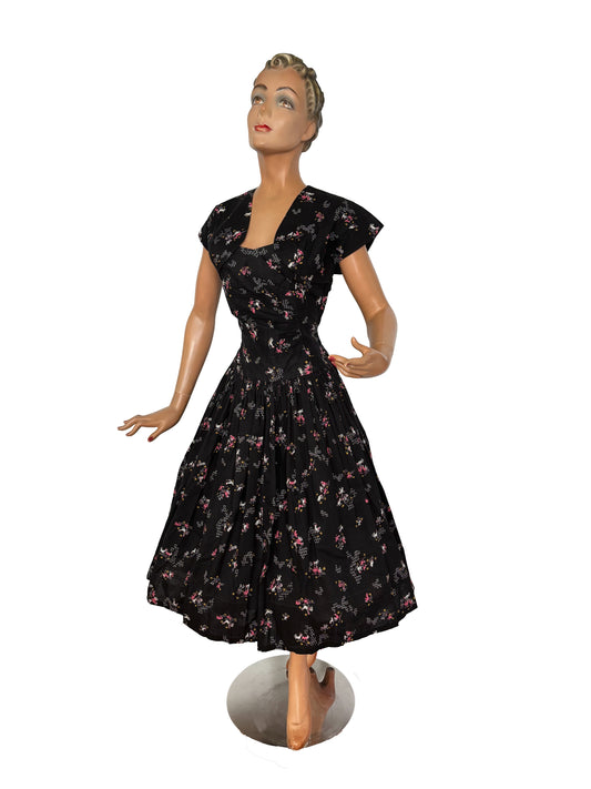 XS | 1950s Black Taffeta Shirtwaist Dress