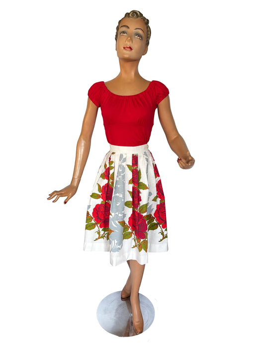 XS | 1950s Poplin Cotton Red Roses Skirt