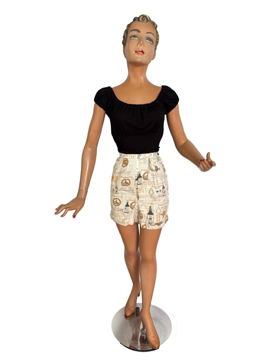 XS | 1950s Style High-Waisted Shorts in Vintage Pedro Domecq Sherry Print Linen