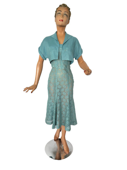 XS | 1950s Tabak of California Lace and Linen Dress and Bolero Set