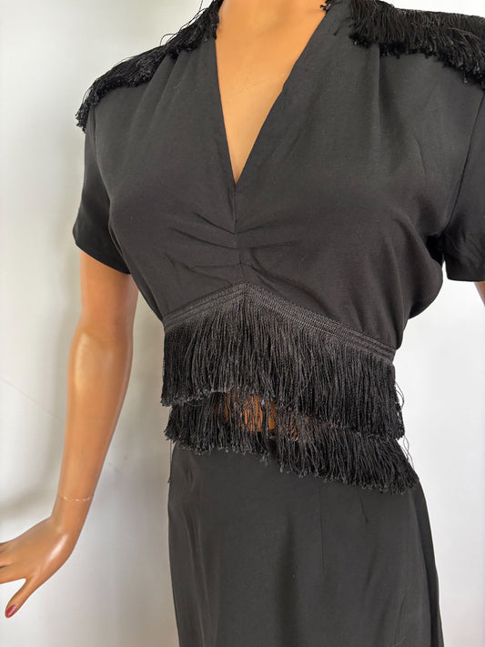 XS/S | 1950s Style Cutout Dress in Black Gabardine with Fringe Detail