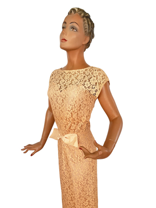 XS/S | 1950s Champagne Lace Dress With Satin Bow and Keyhole Back