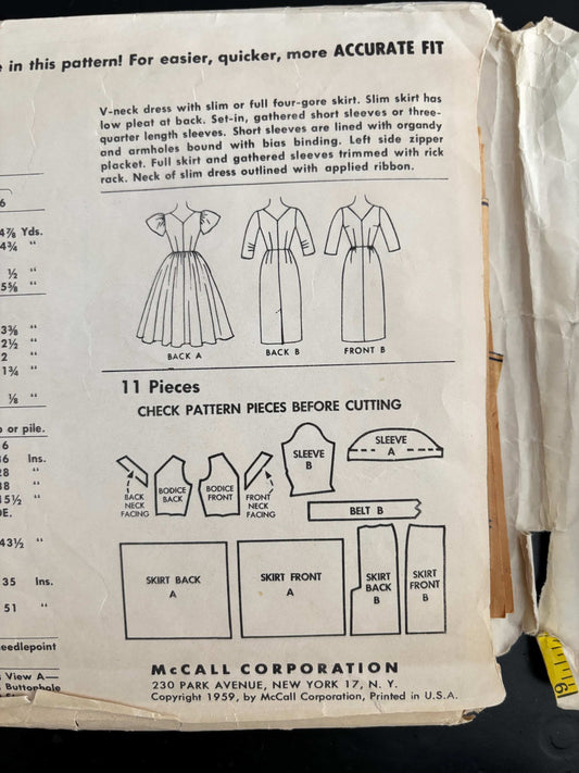 1959 Size 16 Women’s Dress With Slim Or Full Skirt – McCall’s 5151 Sewing Pattern
