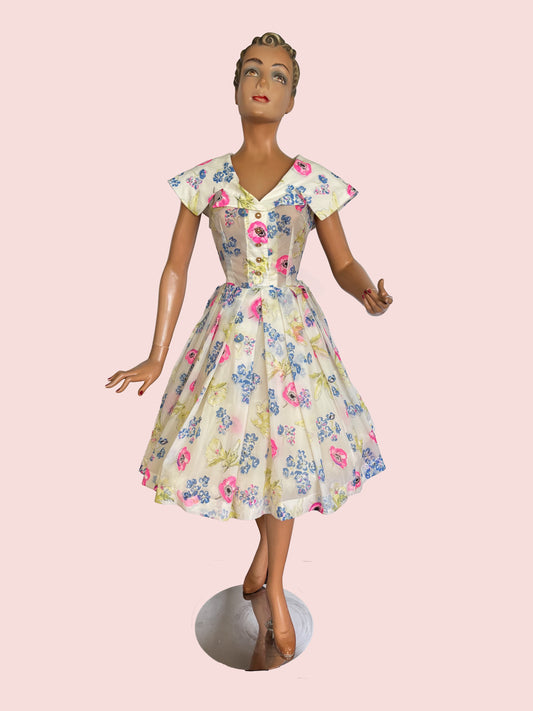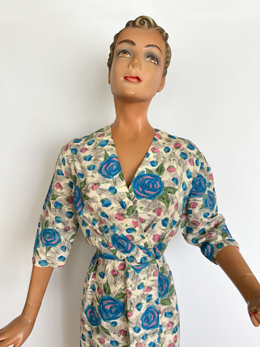 L/XL | 1950s Cream Dress With Blue And Pink Roses by Reba Moden