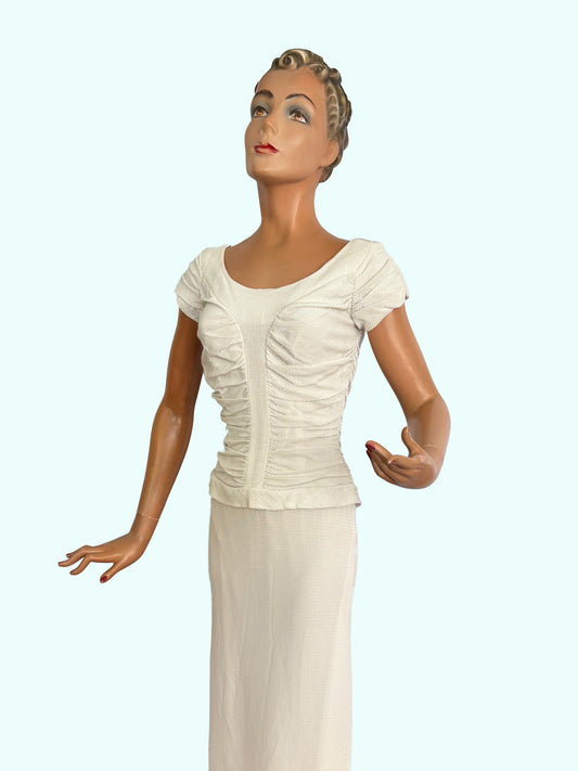XS | 1950s Winnie Marsh Off-White Wiggle Dress With Silver Lurex
