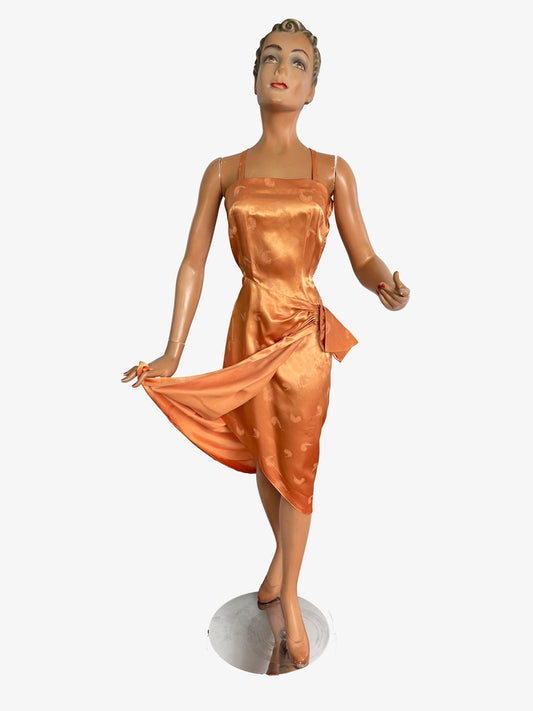 XS | 1950s/60s Satin Jacquard Sarong Dress With Feather Motif