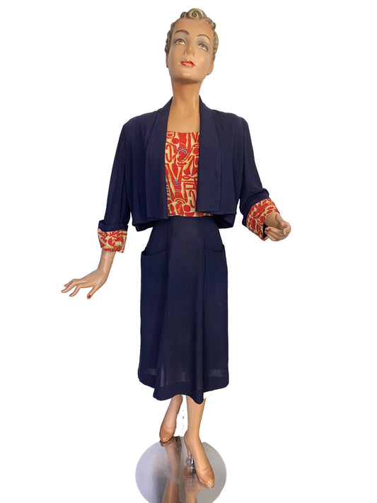S/M | 1940s 'Petite Lady' Rayon / Gabardine Egyptian Novelty Print Dress and Bolero Set