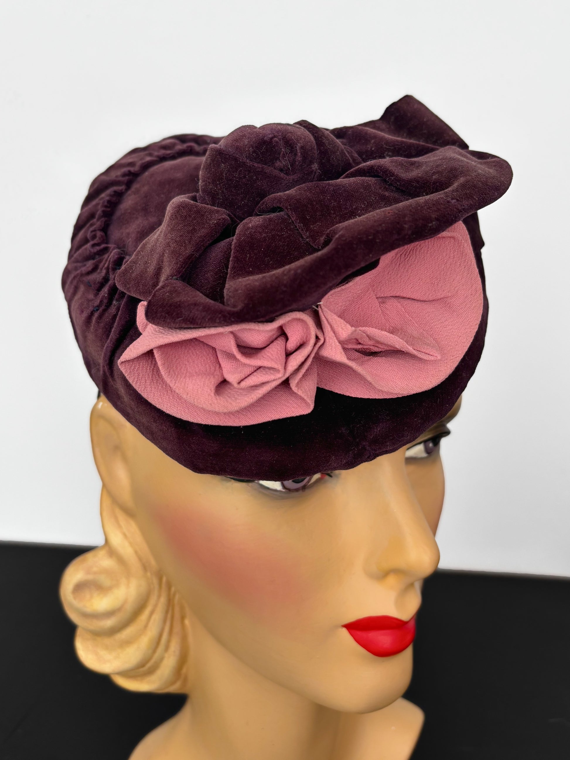 A very pretty 1940s velvet hat in rich chocolate brown, designed with gathered edges along the crown. On top it has a bow accented by two pink crepe roses set between a small flap, creating a beautiful contrast against the dark velvet. The hat comes with an elastic band to secure it in place.