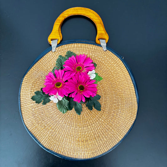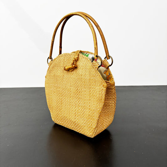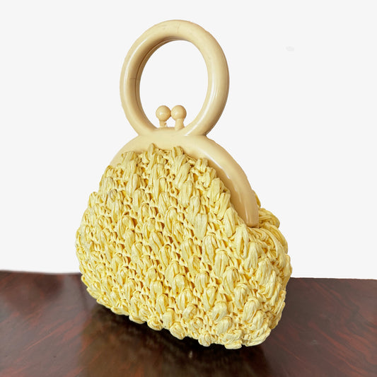 1950s Vanilla Yellow Raffia Handbag with Round Plastic Handle