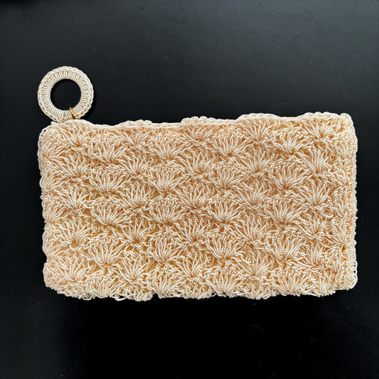 Vintage 1940s 50s Champagne Beaded Clutch with Floral Motif and Zipper Detail
