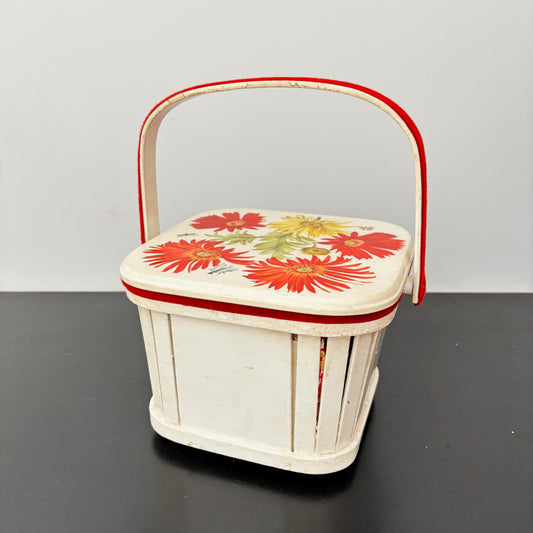 1960s White Wooden Picnic Basket with Floral Lid and Velvet Handle