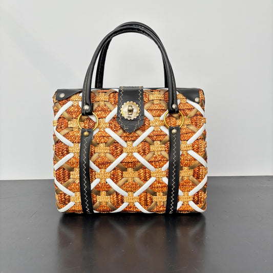 1950s Woven Straw Handbag with Bamboo Handles and Teddy Print Lining
