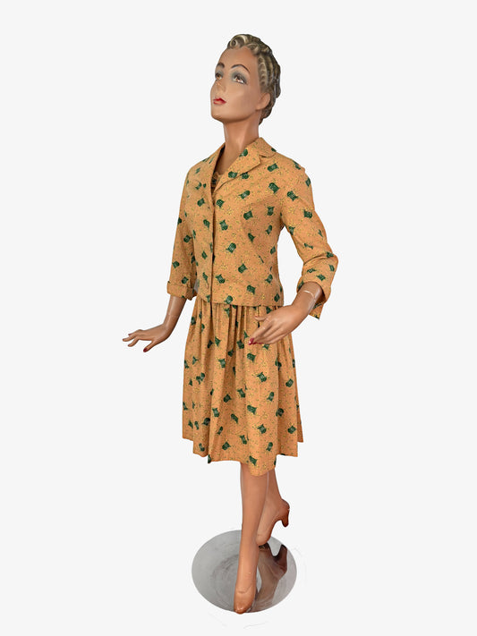 XS | 1950s Two Piece Cotton Dress and Jacket Set with Bandstand Print