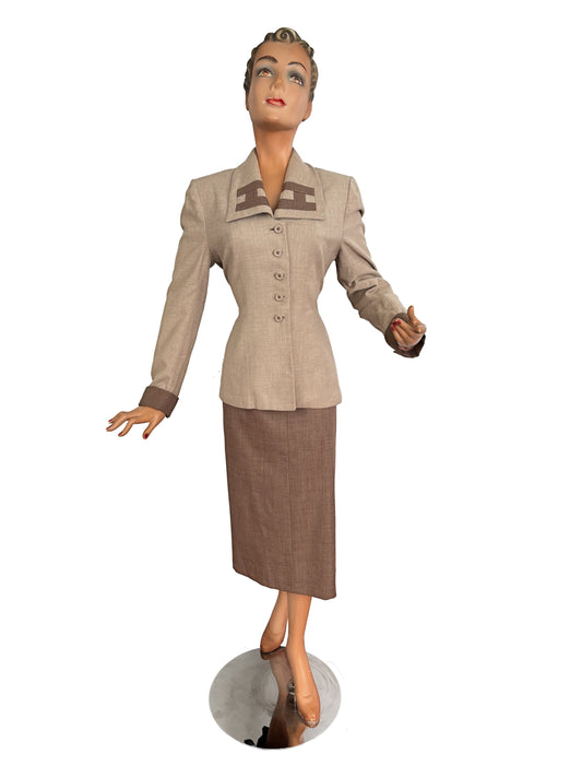M | 1940s Beige Wool Gabardine Blazer With Brown Collar Block Detail