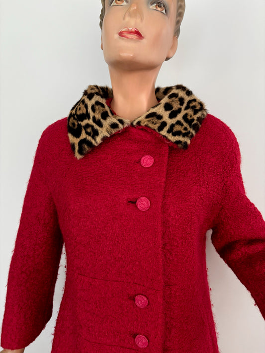 L/XL | 1960s Red Bouclé Coat With Faux Leopard Fur Collar