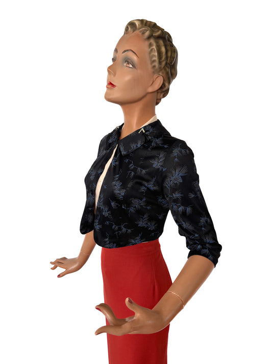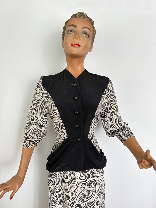 S | 1940s Black and White Paisley Print Two-Piece Suit