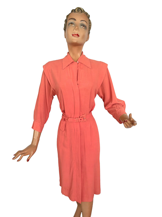 S | 1940s 1950s Flamingo Pink Gabardine Dress