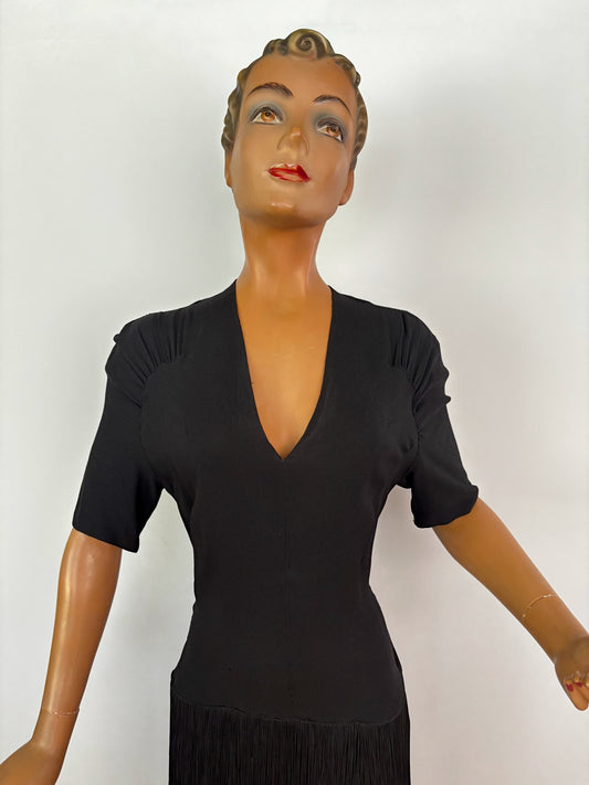 S/M | 1940s New York Creation Black Crepe Fringe Evening Dress
